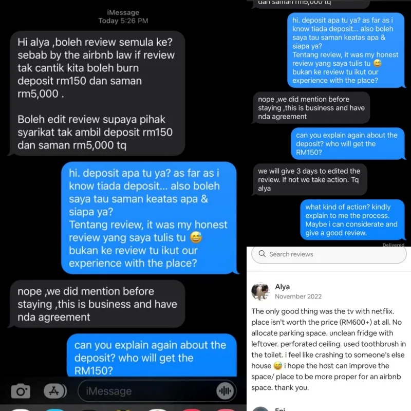 Unsatisfied with their stay, Myra wrote an honest review about the unit on the Airbnb website. She then unexpectedly received a message from the host threatening to sue her for her “bad review”. When asked for further explanation regarding certain processes, the host only insisted that it was part of the agreement before the guests’ stay.