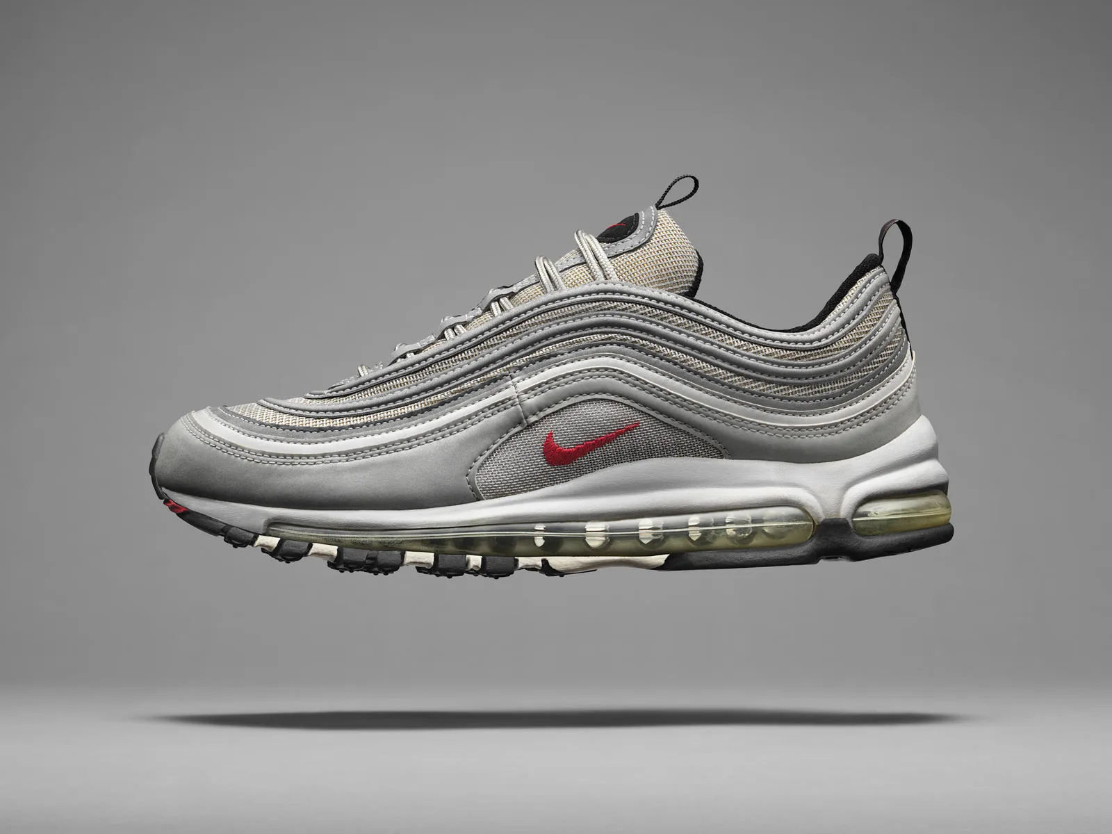 The Nike Air Max 97 marked another leap forward with the first full-length Max Air unit. The groundbreaking shoe demanded an upper to match its audacious innovation. Starting with silver, the fluid design took inspiration from Tokyo’s lightning-fast bullet trains. Reflective piping gave the Air Max 97 a look that amplified in the right light. The perfect shoe for a maximalist period, when more mattered in music, movies and style, it has since become an era-defining design classic.