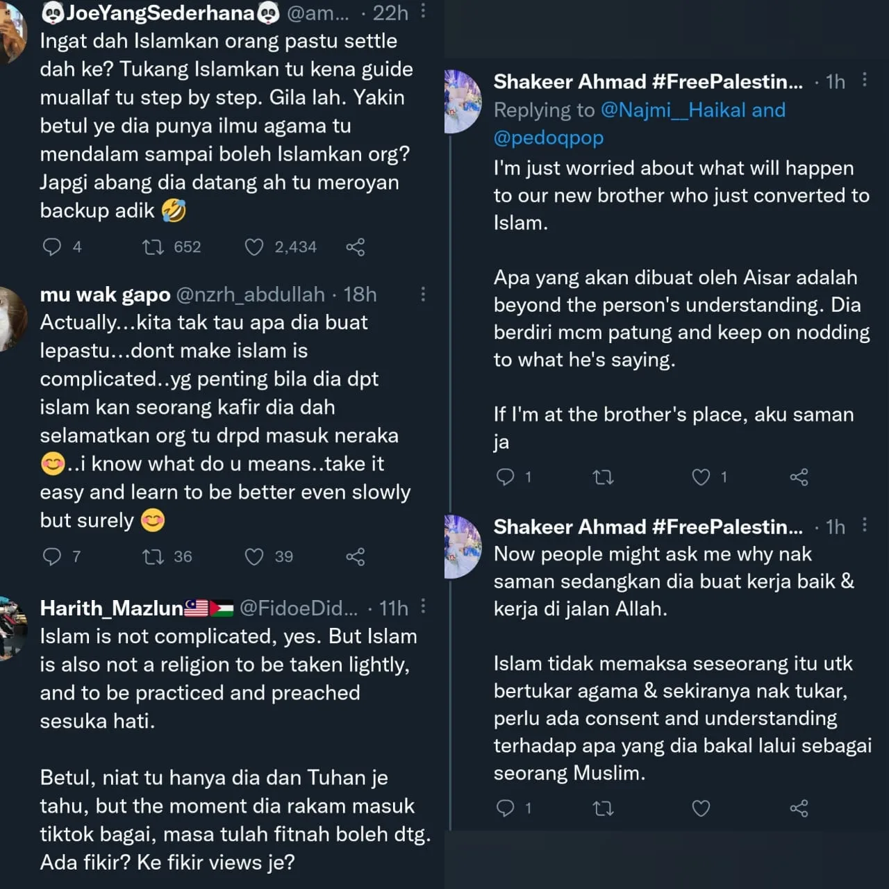 In the 2-minute clip that was originally uploaded on the instafamous TikTok account and his other socials, Aisar Khaled was seen preaching to the male individual about the purpose of life. He was then seen teaching the individual to proclaim the words of shahada (the Muslim profession of faith) before the two hug each other.