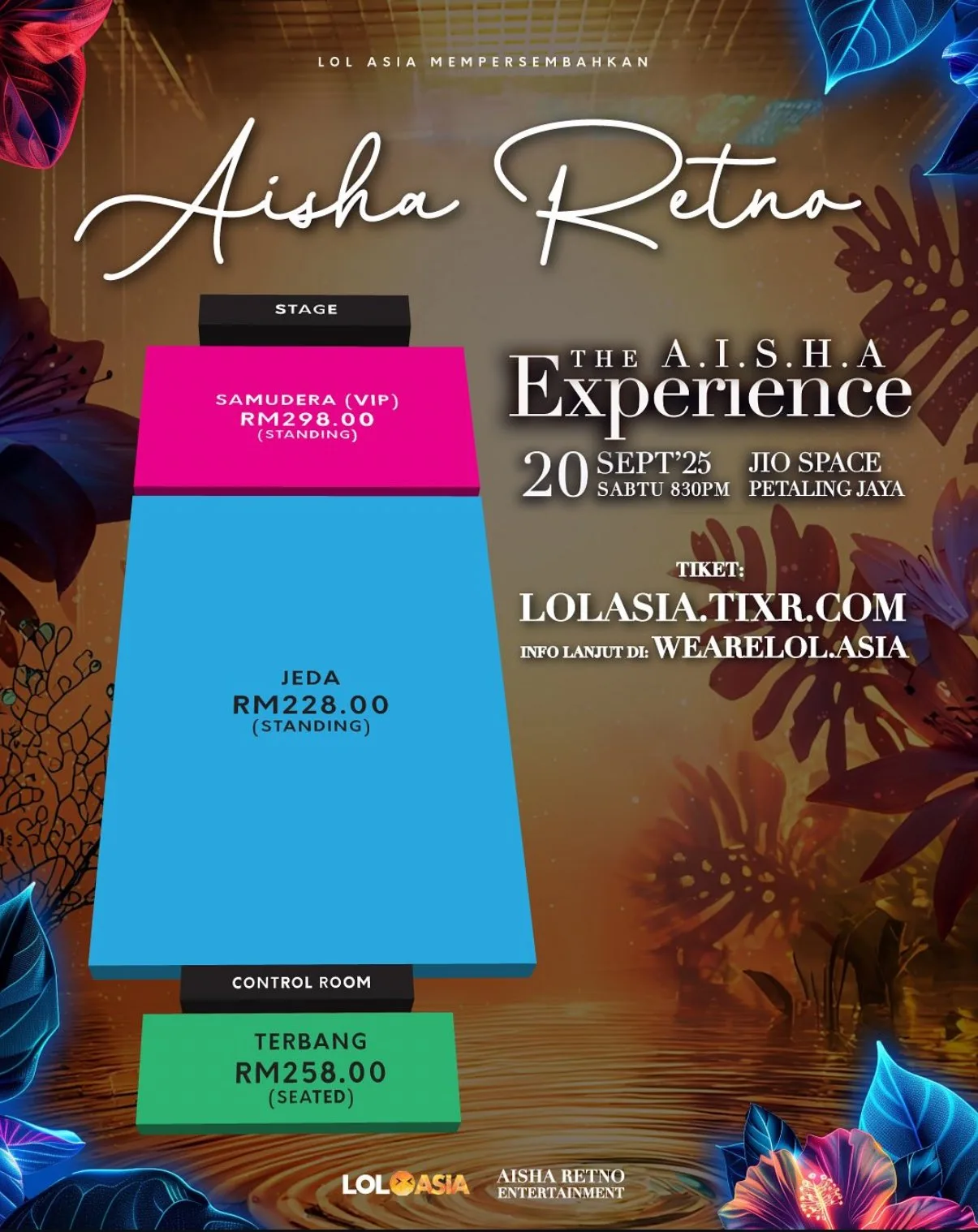 - Ticketing: RM228 (JEDA), RM258 (TERBANG), RM298 (SUMADERA – VIP)
