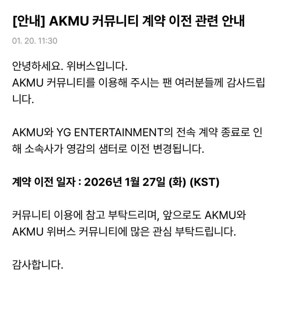 On 20th January 2026 (Tuesday), AKMU’s Weverse fan platform posted an announcement titled “[Notice] Contract Transfer of AKMU Community”. The notice announced that the ownership of AKMU’s fan community will be transferred and changed to “Fountain of Inspiration”, following the end of the group’s exclusive contract with YG Entertainment. The contract transfer date has been set for 27th January 2026.