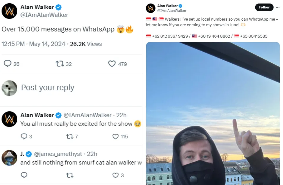 Yesterday (Tuesday, 14th May), Alan Walker shared his phone numbers for Singapore, Indonesia, and Malaysia on social media with the caption, “Walkers! I’ve set up local numbers so you can WhatsApp me – let me know if you are coming to my shows in June! +62 812 9367 9429 (Indonesia) / +60 19 464 8862 (Malaysia) / +65 80415585 (Singapore).” The response was obviously overwhelming with over 15,000 messages received within two hours, highlighting the strong support from his fans.