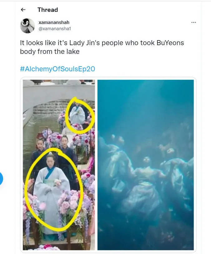 As we see a devastated MuDeok throwing herself into the lake/ocean, 2 mysterious women appear to pull her out of the water. While it was hard to see who these characters were at first glance, eagled-eye fans pointed out that those women could very well be Lady Jin Ho-Gyeong’s people as they were spotted escorting Jin Cho-Yeon during her wedding (that never came to be).