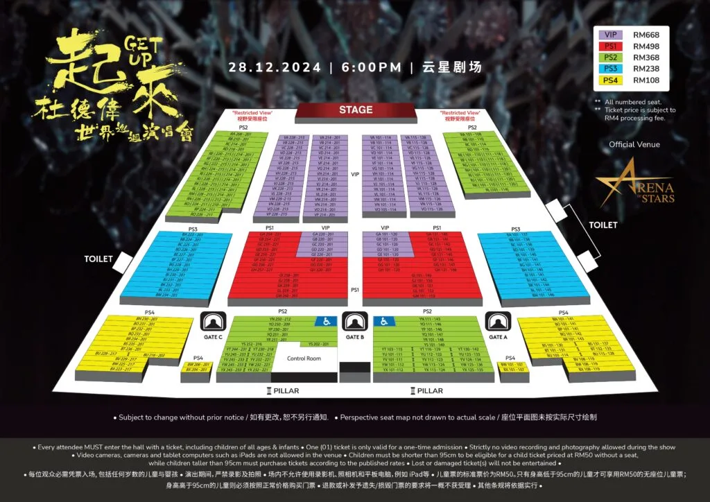 - Ticket Prices: VIP: RM668, PS1: 498, PS2: RM368, PS3: RM238, PS4: RM108