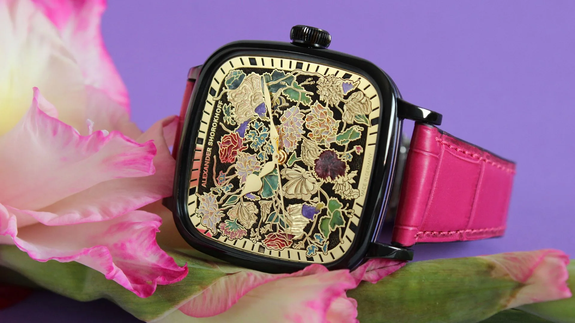 With a bouquet of flowers in the form of a watch, lovingly hand-painted with delicate blooms, he presents her with a reminder of their shared love that will forever flourish.