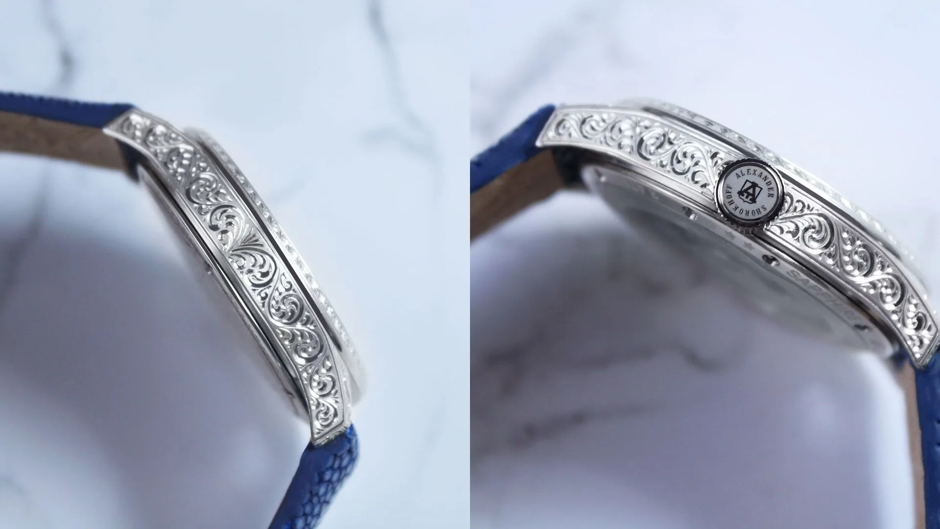The hand-engraved and embellished rotor of the automatic movement perfectly complements the hand-engraved 925 silver case, sized at 39 millimetres. The double-sided sapphire glass underscores the high standards of the Alexander Shorokhoff watch manufacture.