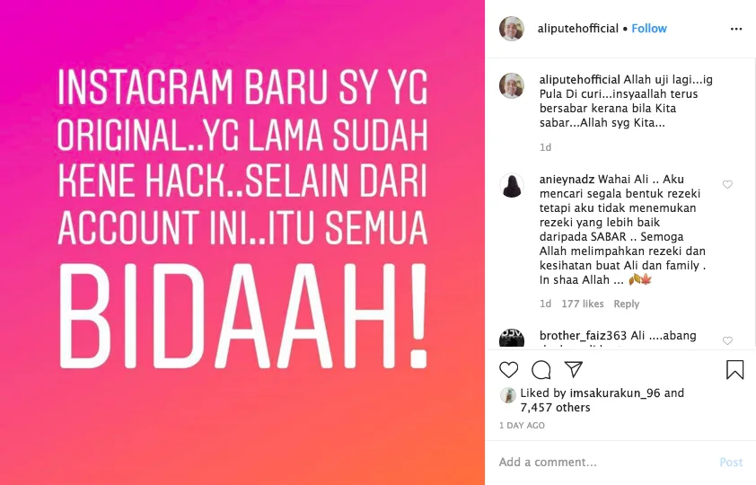 Ali posted a statement on his new Instagram that reads, “This is my latest Instagram account as the old one has been hacked. Besides this account, all other ones are bidaah (heresy).” In response to losing another account, Ali assured everyone by stating that he accepts the test given by God. “Keep calm because Allah loves people who are patient,” he wrote on the caption.