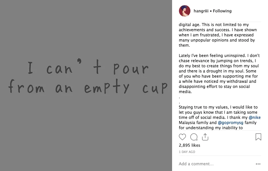 “Staying true to my values, I would like to let you guys know that I am taking some time off of social media. I thank my @nike Malaysia family and @gopromysg family for understanding my inability to participate. I wanna send my love to my supporters who have checked in on me,” she added.