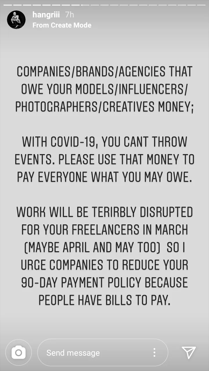 “To all the companies/ brands/ agencies that owe your models/ influencers/ photographers/ creatives’ money. With Covid-19, you can’t organise events. So, please use that money to pay everyone what you may owe. Work will be terribly disrupted in the next few months so I urge companies to reduce your 90-day payment policy because people have bills to pay.