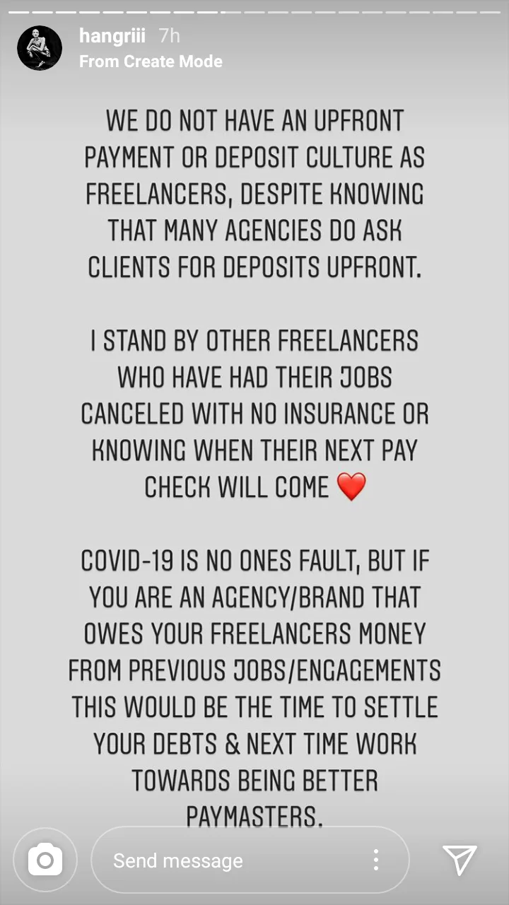 We don’t have upfront payment or deposit culture as freelancers, despite knowing that many agencies do ask clients for deposits upfront. I stand by others who have had their jobs cancelled with no insurance or wondering when their next pay check will come.”