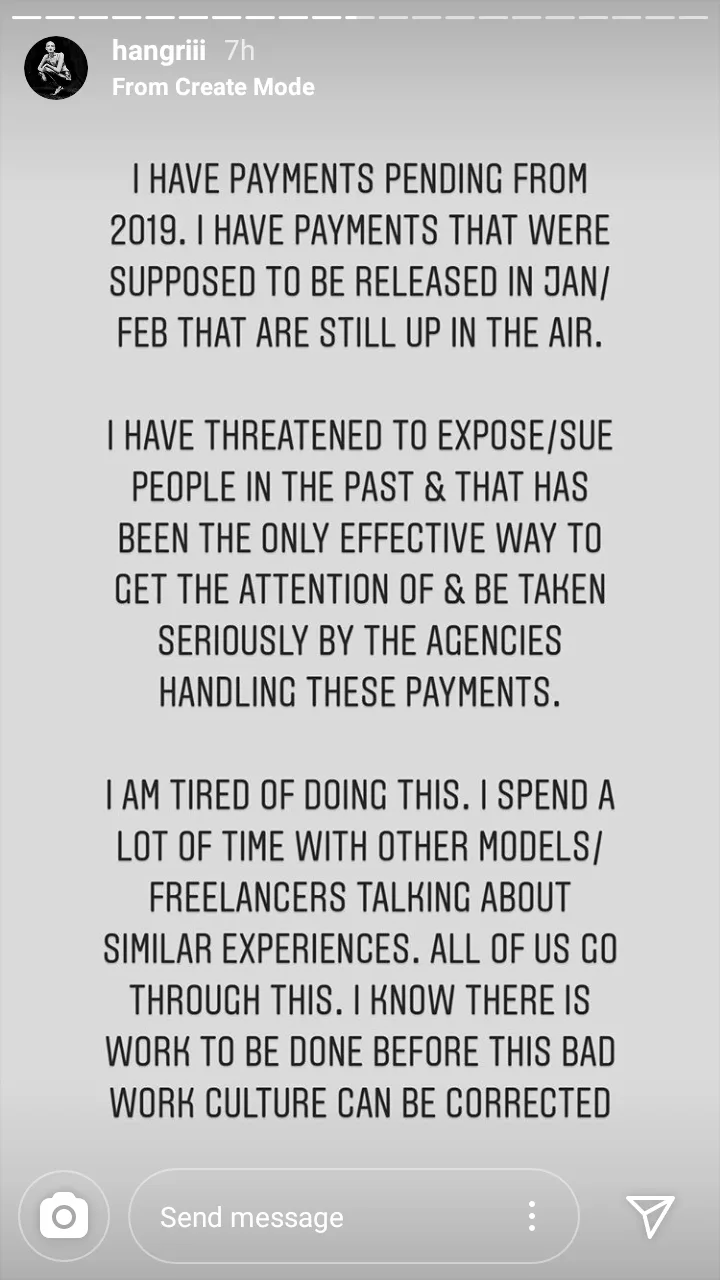 “I’m tired of doing this. I’ve spent a lot of time with other models talking about similar experiences. I know there is work to be done before this bad work culture can be corrected.