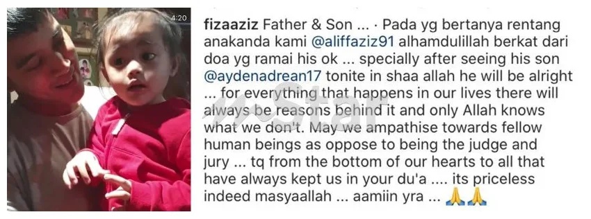 Aliff’s mother, S Hafiza Basharahil took to Instagram to share the good news to everyone. “To anyone who asked about my son’s condition, praise to God for everyone’s prayers, he is okay. After meeting his son (Ayden Adrian) last night, fingers crossed that his condition will improve,” S Hafiza wrote on the caption.