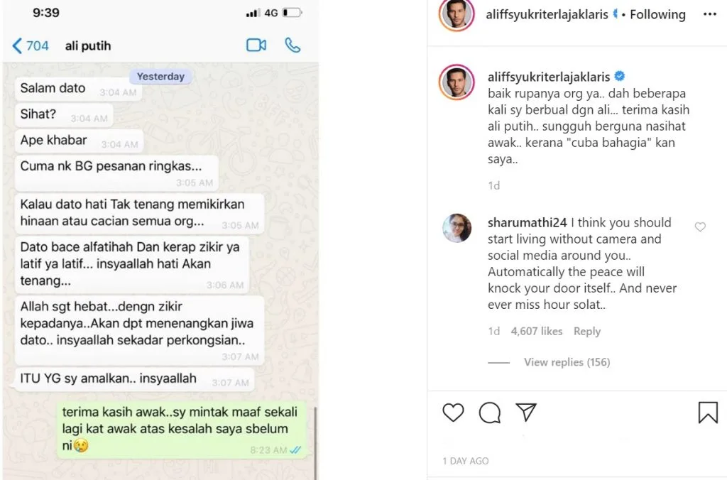 The “Cuba Bahagia” singer replied, “Thank you… Again I apologise for all the mistakes I’ve done in the past.” In the caption, Dato’ Aliff described Ali as a good person. He further thanked the “Maharaja Lawak Mega” winner for sharing his helpful advice.