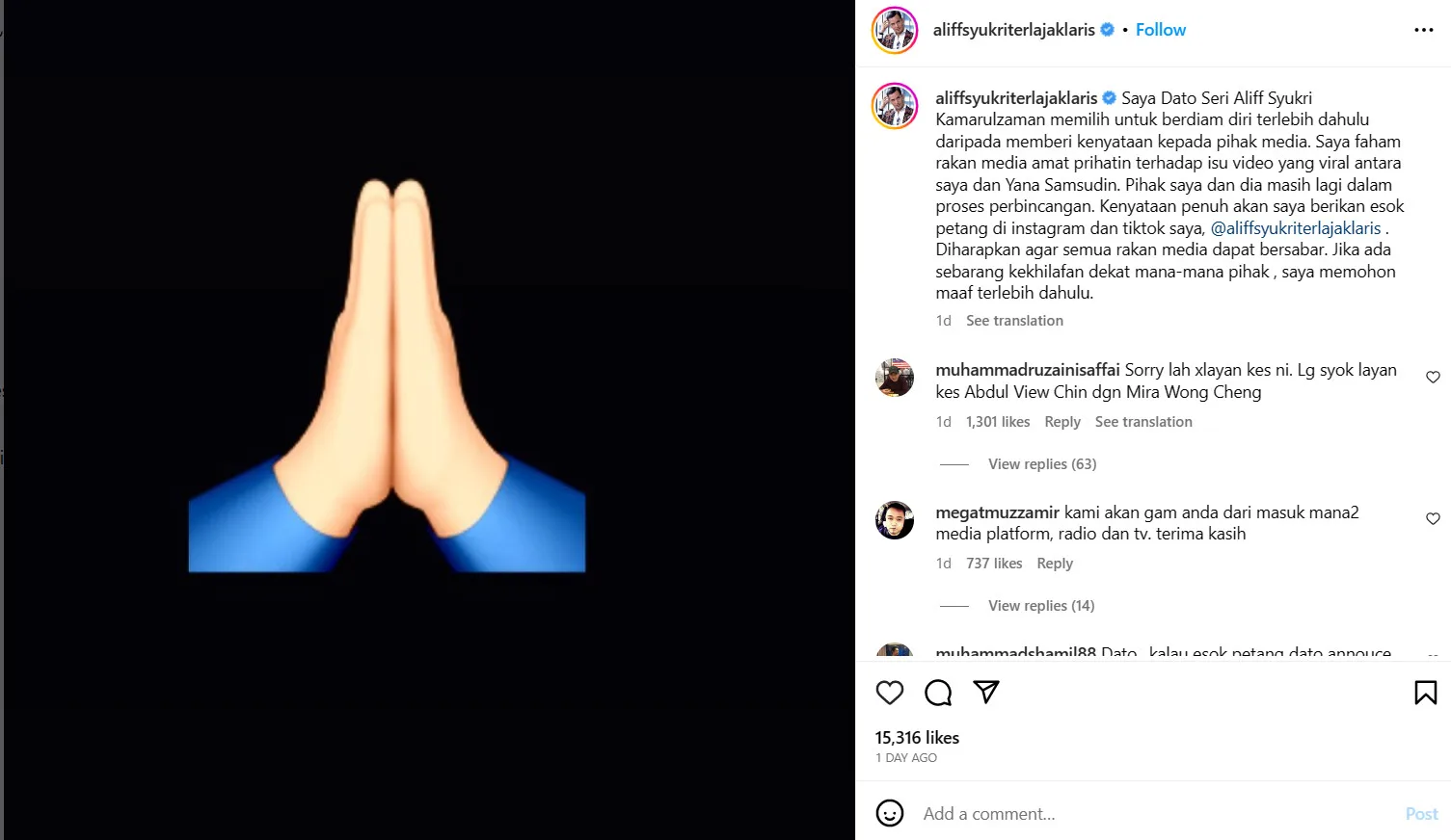 Yana immediately took to her Instagram to explain her side of the story. Aliff, on the other hand, has yet to break his silence regarding the drama. “I’ve chosen to remain silent for now before coming up with any statements for the media. I understand that most of you are concerned about the issue surrounding the viral video of me and Yana Samsudin. We are still in the midst of discussing some things. I’ll provide the full statement soon on my Instagram and TikTok,” the “Cak Kun Cak Raya” singer wrote on Instagram.