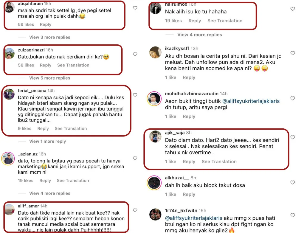 However, the posting has in turn incited more backlash from the public. Most of them called out Aliff for poking his nose into other people’s marital affairs. Others also accused the 36-year-old celeb of deliberately wanting to “change the subject”. One netizen wrote, “He hasn’t resolved his own issue, yet he still went to solve other people’s issue,” while another questioned, “I thought you said you want to stay silent?”