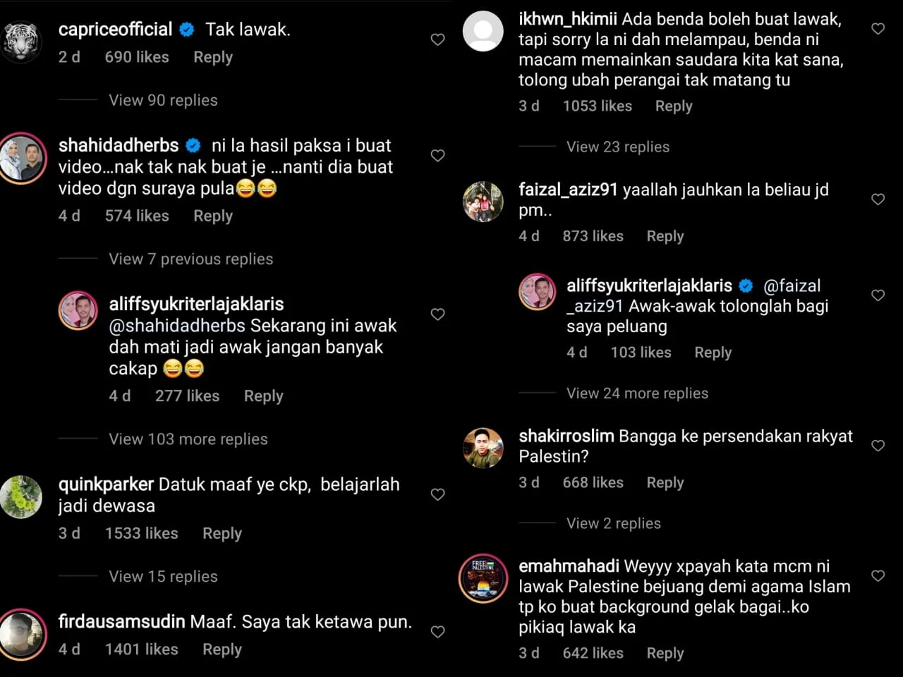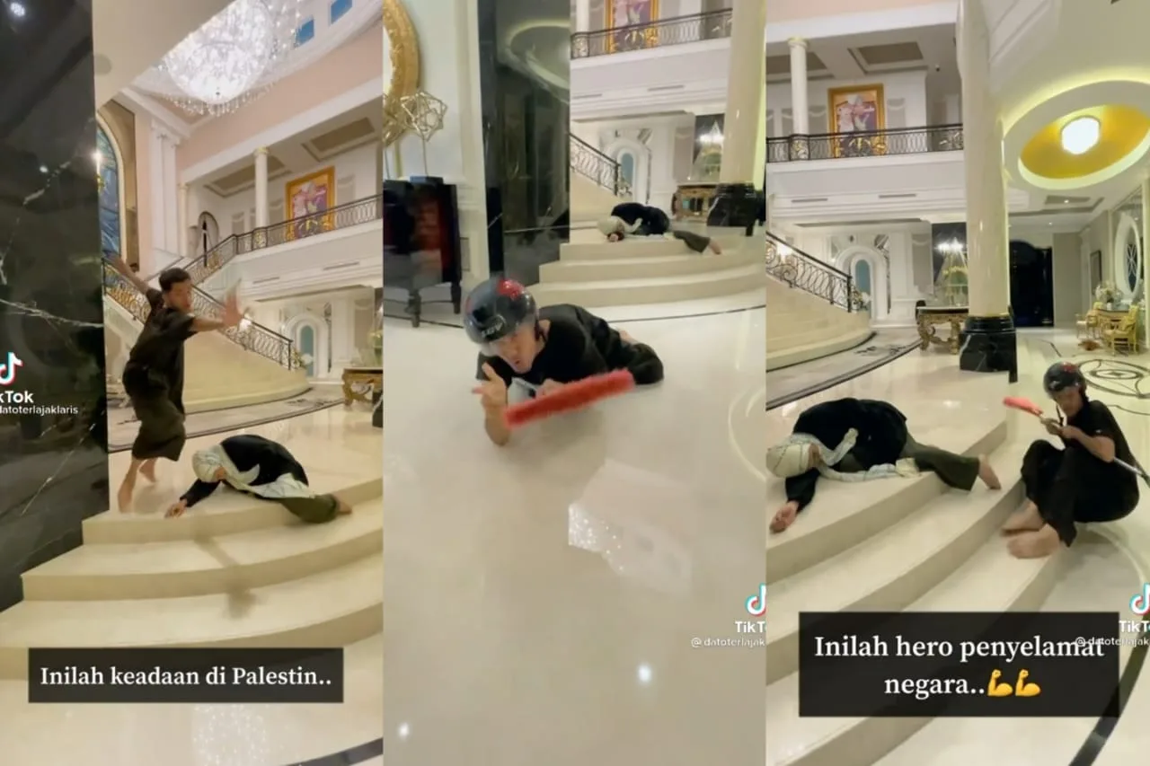 The video that was uploaded on the entrepreneur’s socials including Instagram and TikTok displeased netizens when Aliff Syukri appeared to be wearing a helmet and carrying a broom apparently portraying a Palestinian fighter who allegedly rescued an injured woman acted by his wife. “This is the situation in Palestine… this is the nation’s hero,” captioned Aliff Syukri in the clip briefly.