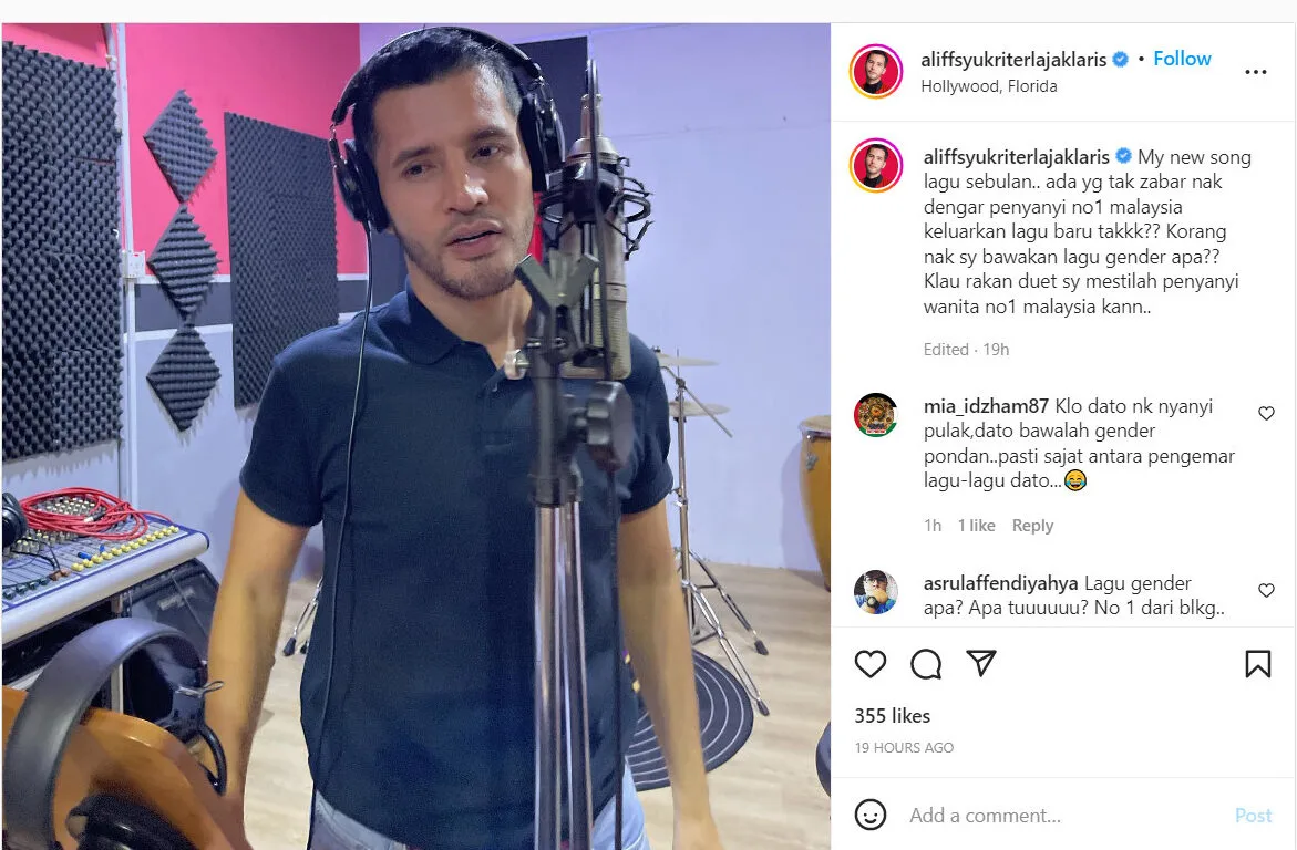 Last night (Tuesday, 26th July), Aliff shared an image of himself in a recording studio. But it isn’t just the photo that caught the attention of netizens. It’s the caption! He revealed that he will be releasing a duet with the “Number 1 female singer” in Malaysia!