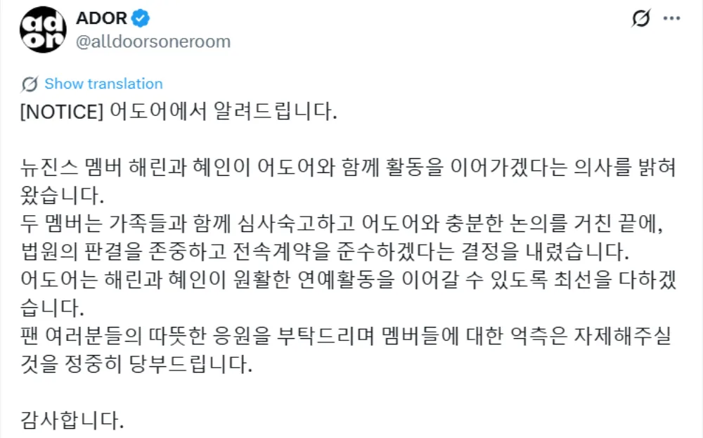 On 12th November 2025 (Wednesday), ADOR released a statement announcing that Hyein (혜인) and Haerin (해린) will return to the agency to uphold their exclusive contracts, out of respect for the court’s ruling. Understandably, this initial statement sparked concern that the quintet might split. However, shortly after, Minji (민지), Hanni (하니) and Danielle (다니엘) announced their plans to also return to the label.