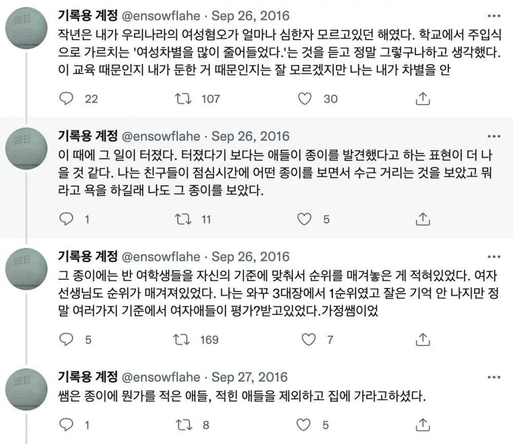 “I still didn’t know how serious our country’s misogyny was last year. In school, they always taught that discrimination against females has decreased, and I really thought it was true. I don’t know if it’s because we were taught this, that I was more dense to it, but in the middle of this is when the situation exploded. Instead of saying it exploded, maybe it’s better to say a kid found a paper.