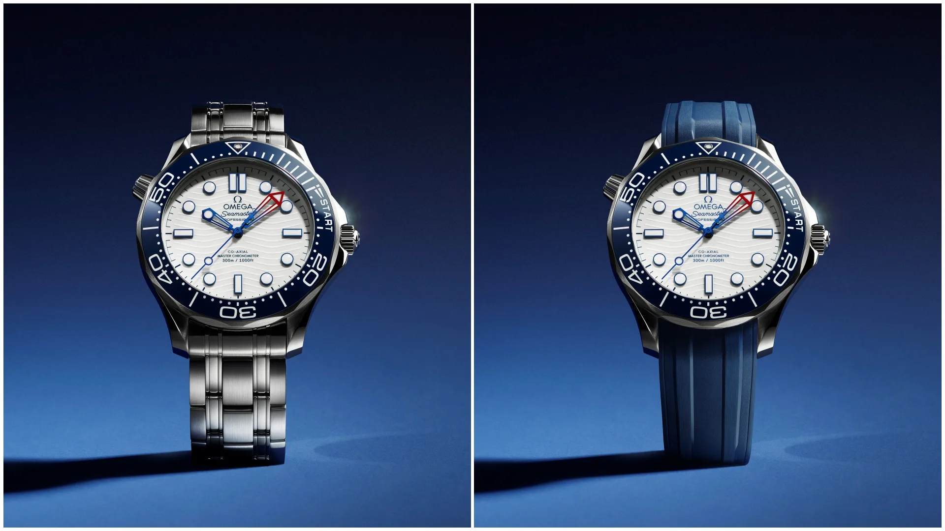 The watch, presented in a commemorative blue box with red stitching, can be worn two ways: on a stainless-steel bracelet or blue rubber strap. Both fixed with OMEGA’s patented Quick-Change system.