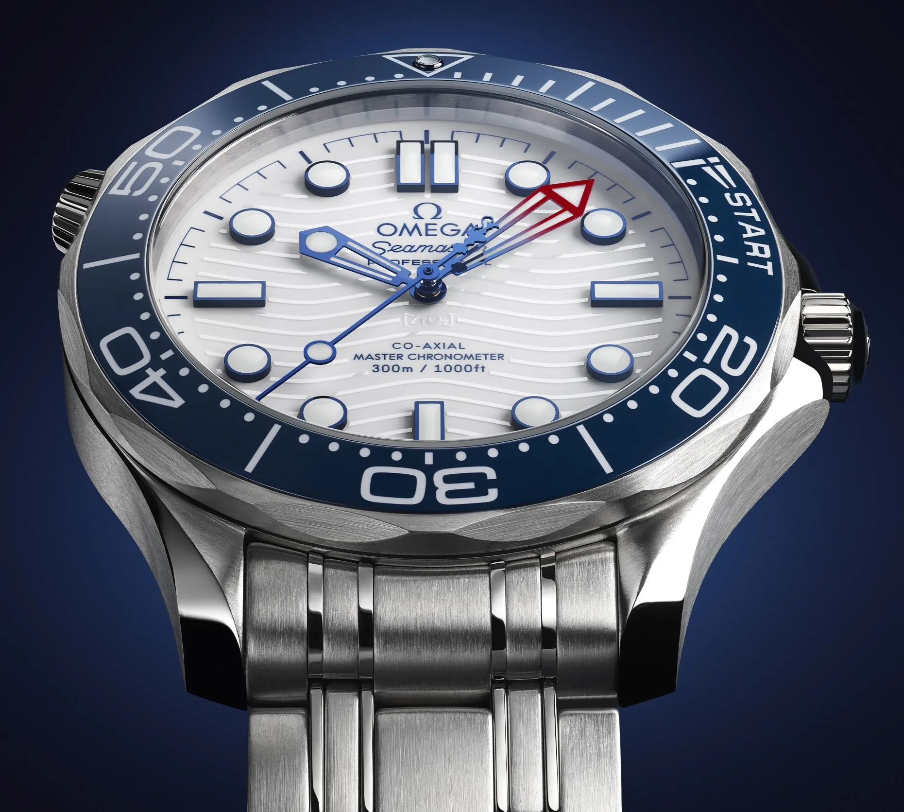 OMEGA’s 42 mm Seamaster Diver 300M in stainless steel has a blue ceramic unidirectional bezel with a regatta scale, comprised of two 5-minute pre-start sections, and START section with regatta-inspired flag.