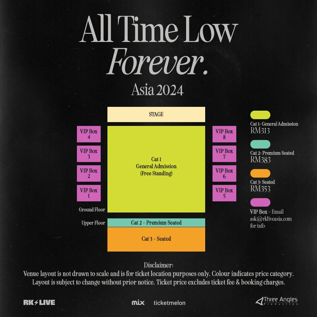 Attached below is the official seating plan and ticket prices for All Time Low’s concert in Zepp KL (Malaysia). As at time writing, Cat 2’s Premium Seating has already sold out. Fret not though, as Cat 1 and 3 are still available.