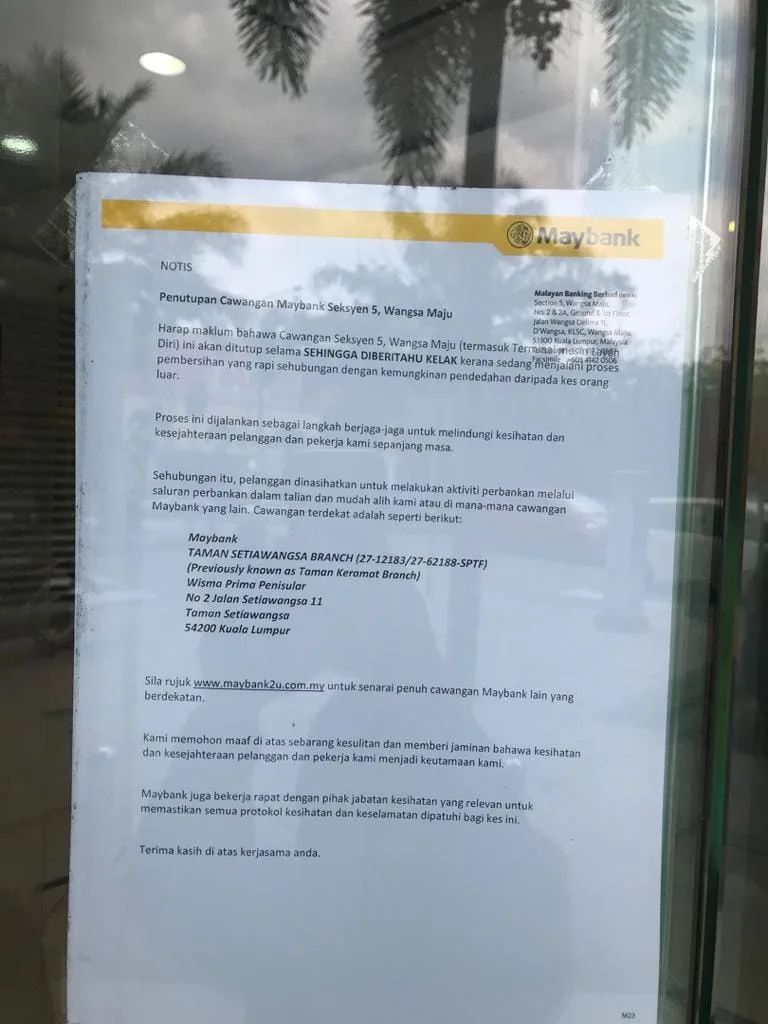In the 2 separate notices issued by Maybank, the Sri Petaling and Wangsa Maju outlets are now closed after “possible exposure to a case involving an external person“. The public is informed that the deep cleaning is necessary “as part of our stringent precautionary measures to protect the health and wellbeing of customers and employees at all times“.