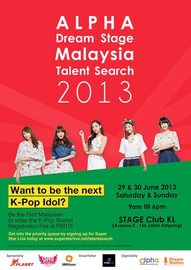 For the first time in Malaysia, you will have a chance to fulfill your dreams of becoming a K-Pop star! How? Well, this one occasion, “Alpha Dream Stage Malaysia Talent Search 2013” is specially brought to you by Alpha Entertainment. Alpha Entertainment Group (Alpha) is a Singapore-owned Entertainment Company. They strive to groom talents from Asia, for Asia and beyond.