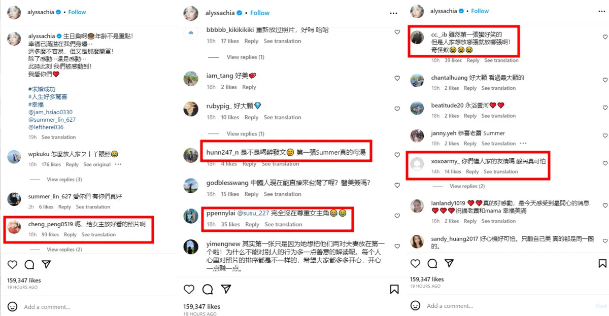 “Are you drunk posting?” one asked. Another opined Alyssa had “no respect for the female lead (Summer) at all“. Some even suggested she repost the photos or rearrange them to put the more flattering photos first. However, there were a few who supported Alyssa’s actions. “People can (arrange) it however they want!” one protested. Another opined netizens should leave it alone as they “didn’t understand (Summer and Alyssa’s) friendship“.