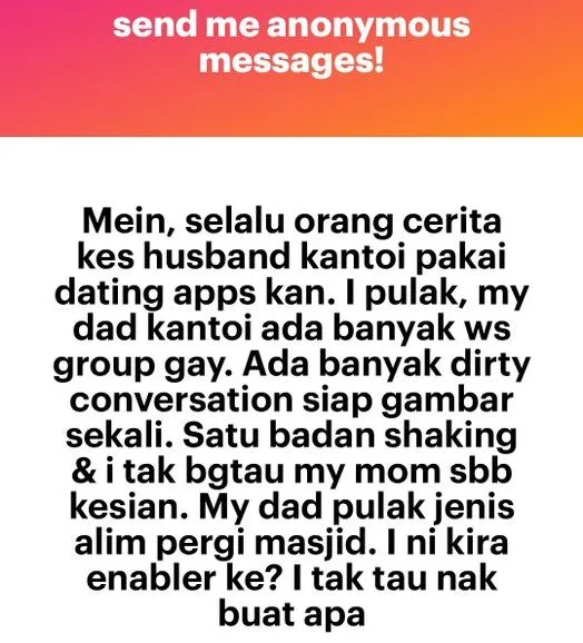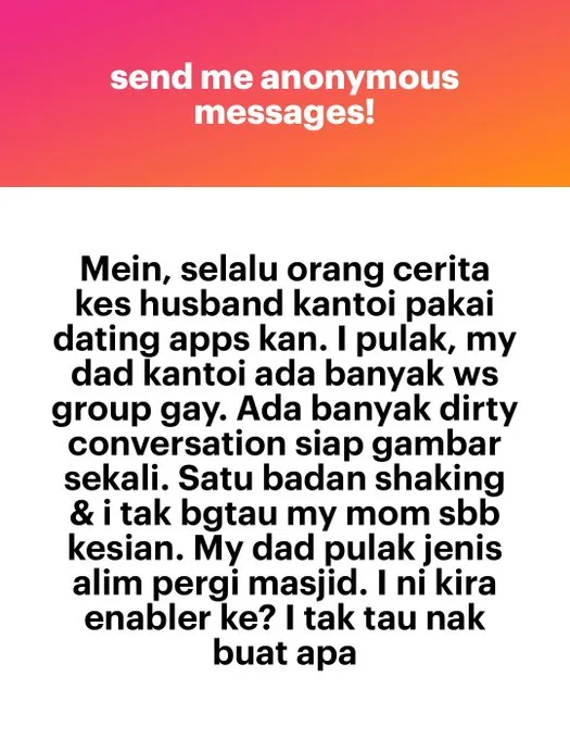 Yesterday (Wednesday, 20th December), Twitter user @/meinmokhtar posted an anonymous submission from a netizen confession via the NGL link. The unnamed individual expressed that they’re seeking advice after discovering their father’s alleged infidelity.