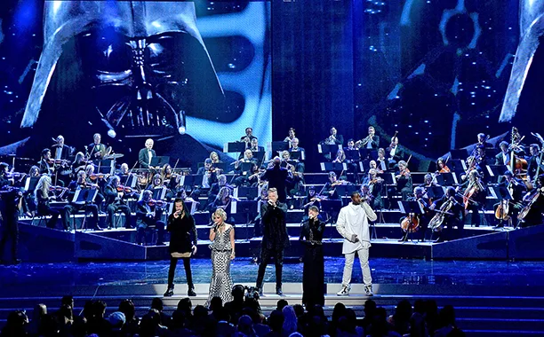 Decked in “Star Wars”-influenced gear, Pentatonix then paid a beautiful homage to legendary composer John Williams’ iconic “Star Wars” film score. Back by a full orchestra. And with classic scenes from the beloved franchise playing behind Pentaonix, no less!
