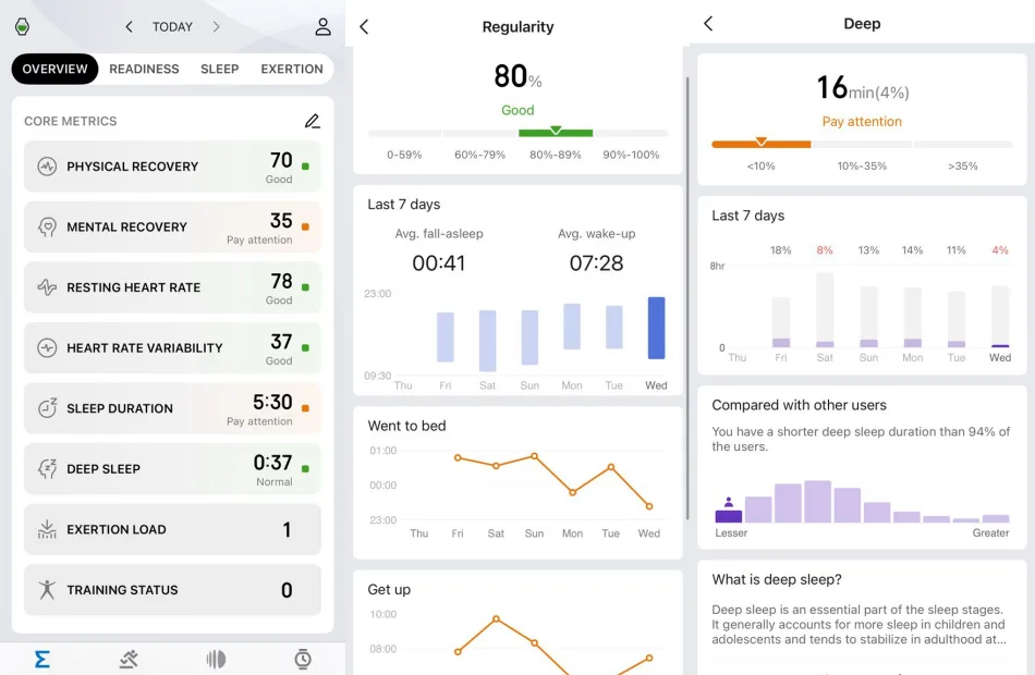 After testing out the sleep tracking feature on the Amazfit Balance 2, I discovered a lot about my sleep patterns. I wore the smartwatch to bed, and it has genuinely helped me take my rest more seriously. The data collected is presented via the Zepp app, which highlights the areas of my sleep metrics that need more attention. As you can see from the screenshots, my Deep Sleep results haven’t been great over the past few days, and it’s clearly had an impact on my mental recovery.