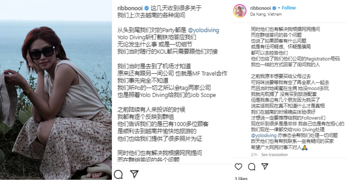 Amber isn’t the only once who has been implicated in this. Another local artist Ribbon Ooi (黄若熙) too has been dragged into the mess. Ribbon claimed she had participated in a planned-joint trip between MF Travel and another company. While she enjoyed it immensely and recommended the package to others, she too had not foreseen the problems popping up now.