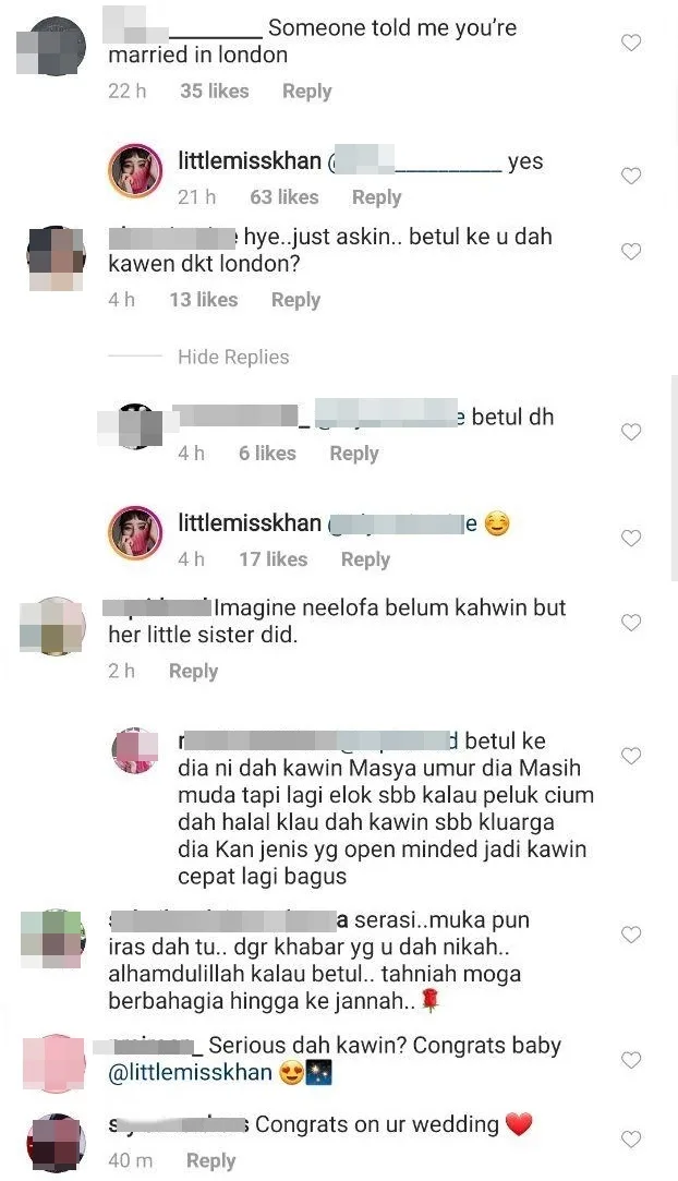 All of a sudden, rumours started circulating that the 20-year-old has already tied the knot with Idzham. One netizen commented, “Someone told me you’re married in London.”. Ameera simply replied, “Yes”. Refusing to believe her initial answer, another user posted similar question, before she replied with a smiling emoji.