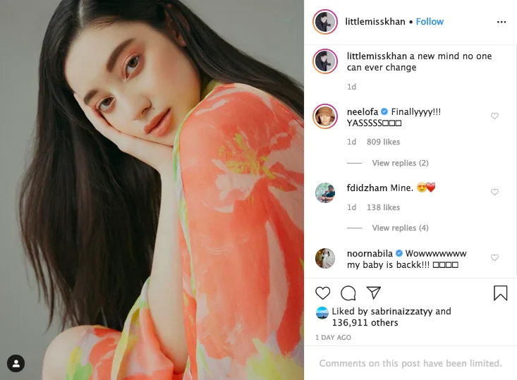 A number of fans who have been patiently waiting for Ameera’s long-awaited return seemed excited knowing that she’s back online. Her elder sisters, Neelofa and also Noor Nabila, also celebrated the news by leaving heartwarming remarks on the comments section.