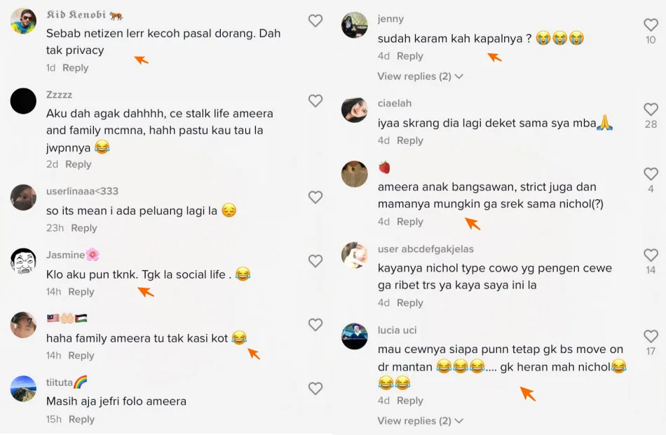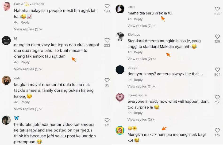 Scrolling through the comments section on the TikTok post, many netizens from neighbouring countries came up with several assumptions about their relationship. In this case, one netizen pointed out that Ameera had already deleted all the comments left by Jefri on her posts.