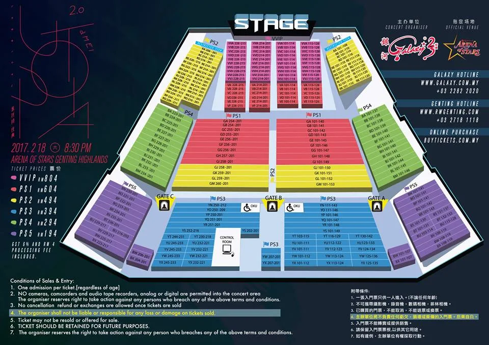 - Tickets: RM 804 (VVIP), RM 604 (PS1), RM 494 ( PS2), RM 394 (PS3), RM 294 (PS4) & RM 194 (PS5)