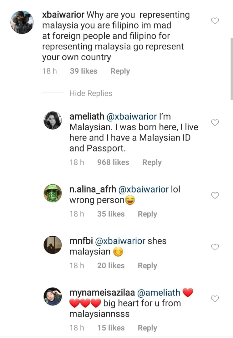 “Why are you representing Malaysia? You are Filipino. I’m mad at foreign people and Filipino for representing Malaysia. Go represent your own country,” read the comment.