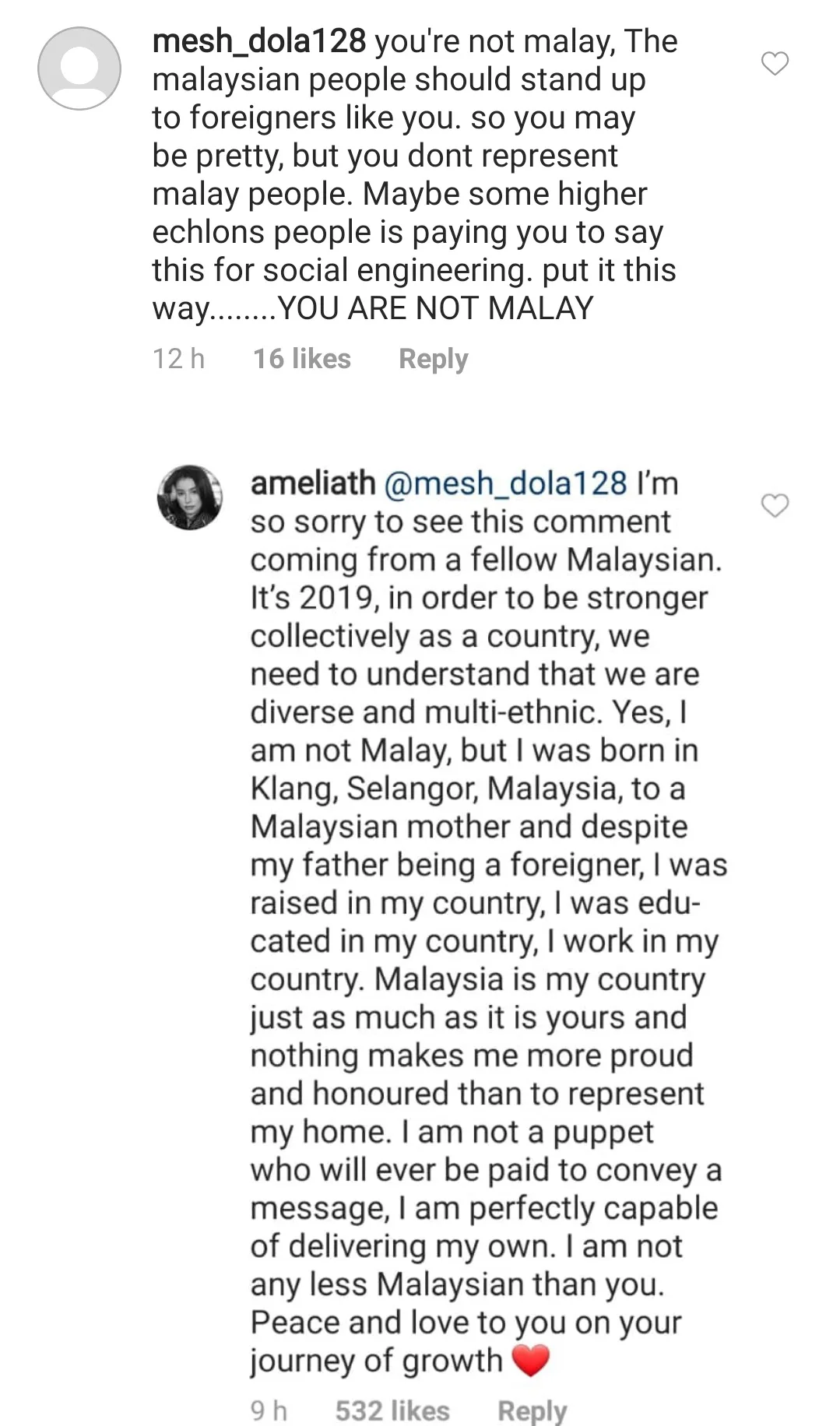 “You’re not Malay, the Malaysian people should stand up to foreigners like you. You may be pretty, but you don’t represent Malay people,” read one comment.