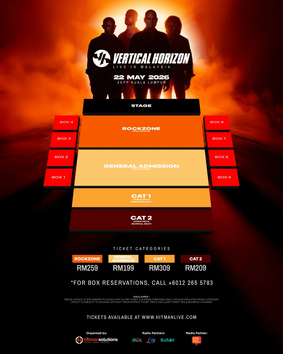 The concert will take place on 22nd May 2026 (Saturday) at Zepp Kuala Lumpur and promises an electrifying set filled with fan favourites and beloved classics, offering audiences the chance to relive the soundtrack of the late ’90s and early 2000s. Fans can expect a powerful live experience as Vertical Horizon brings its iconic songs to the stage.