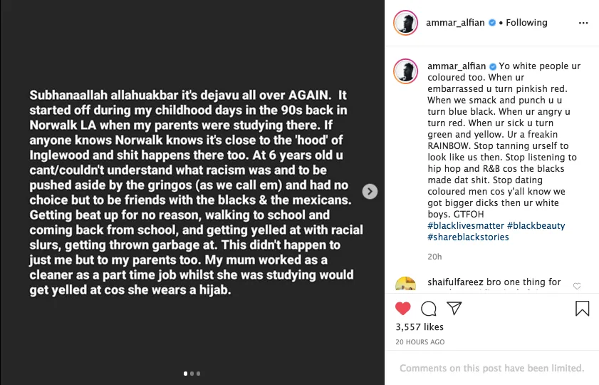 Unfortunately, Ammar faced similar situations even after returning to our shores. “This happened in Malaysia too. I was called ‘Bangla’ and ‘Keling’ (racist terms for people with dark skin) back in school and I never understood why. (I thought about) what was so wrong till these people would call me names? As years go by, I realised that it was because of my skin colour,” the 35-year-old wrote.