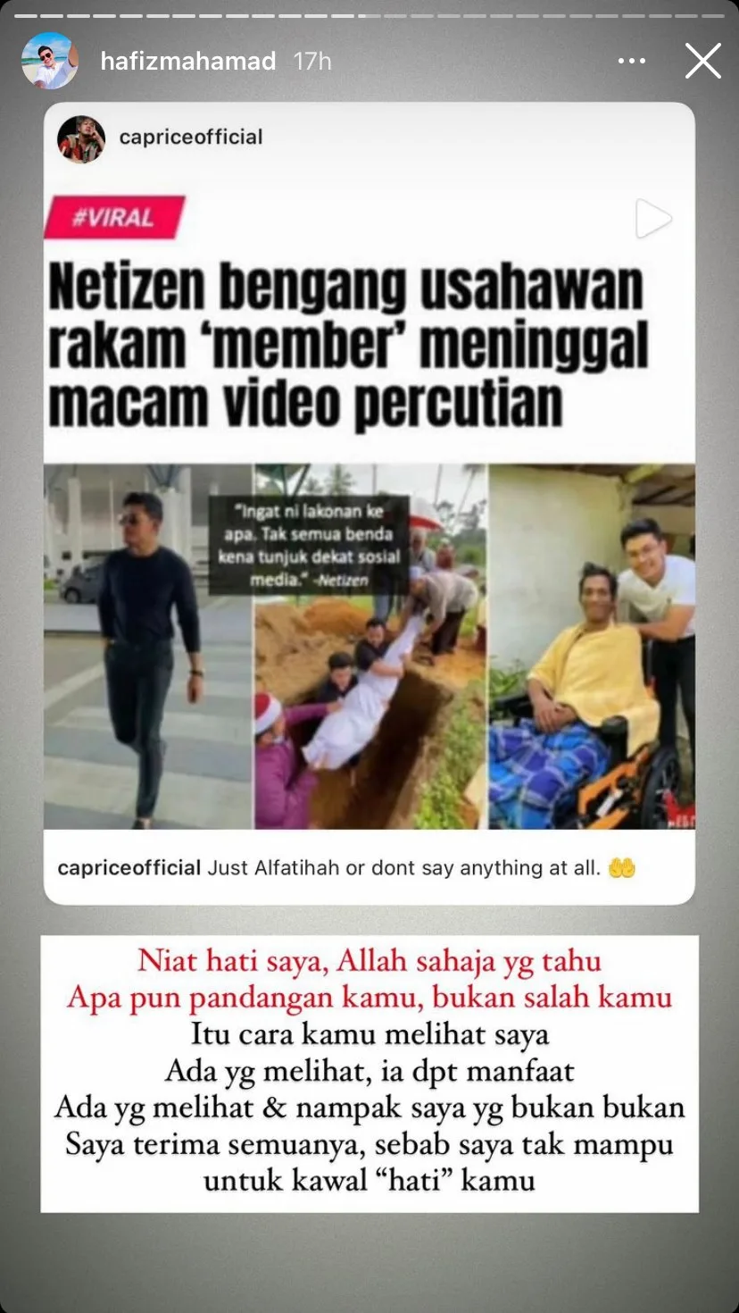 Refusing to stay silent, Hafiz later took to his Instagram Story to shed some light on the matter. He reposted a clip of popular rapper-turned-social media star Caprice addressing his controversial action on his Instagram Story.