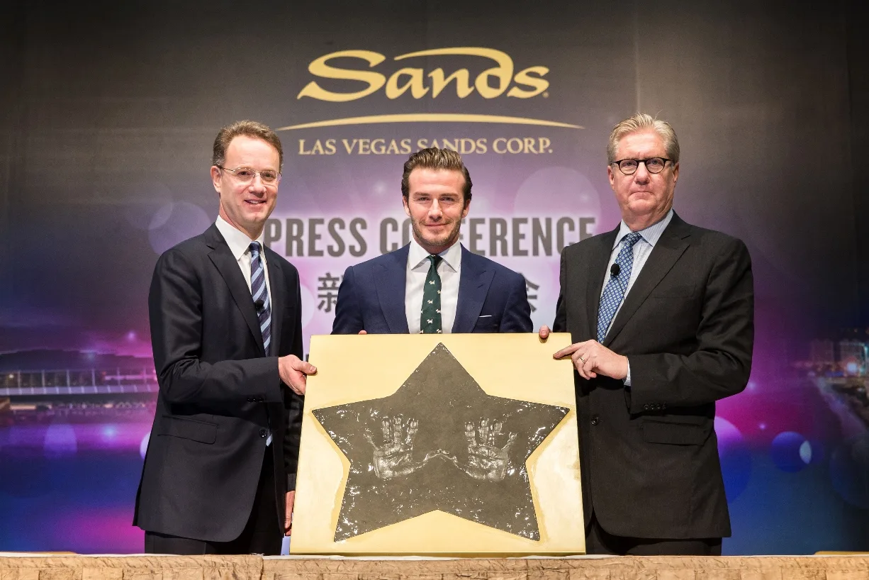 Left to right: George Tanasijevich, president and chief executive officer of Singapore’s Marina Bay Sands; David Beckham; Edward Tracy, president and chief executive officer of Sands China Ltd.