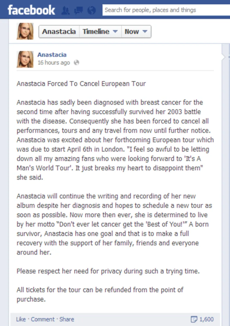 In 2003, pop singer Anastacia successfully overcame breast cancer – but it came back. The 44-year-old star confirmed that she has once again been diagnosed with the disease, forcing her to cancel her upcoming world tour, “It’s A Man’s World Tour”. It was supposed to include stops in Europe after kicking off in London on 6th April 2013.