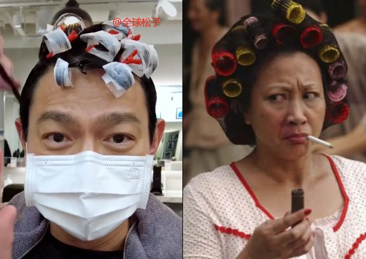 Although Lau looked fairly calm when seated in the barber chair, his clasped fidgeting hands gave him away. He let the hairstylist roll his hair into curls, even taking a moment to wave at his watching fans. Many were amused to see the star sitting with rolls in his hair. Some commented he resembled the landlady played by Yuen Qiu (元秋) in “Kung Fu Hustle”.