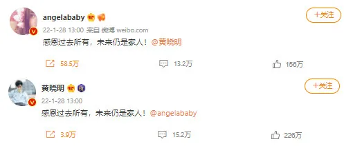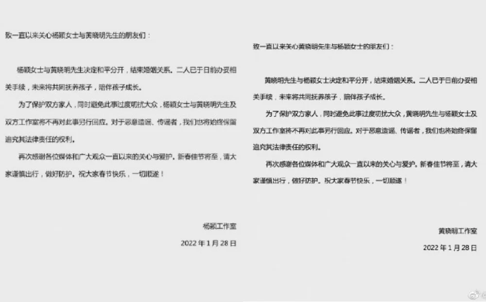 Both Angela and Xiaoming announced their divorce on their Weibos. They posted the same message, but tagged each other. “Thank you for everything in the past, (we will) still be a family in the future!” they wrote. Their studios also released an official statement regarding the matter. “In the future, (Angela and Xiaoming) will jointly raise (their) children and accompany them in growing up,” the statement claimed.