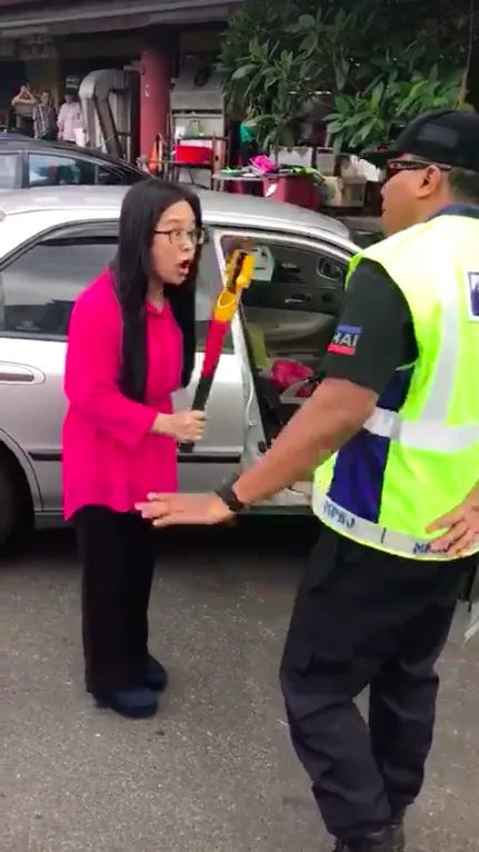 In the video, she can be heard screaming at the top of her lungs, “Saya beli makanan untuk OKU (disabled person), salah tak? Salah tak?! You beritahu saya, salah tak?” (Translation: I’m buying a meal for a disabled person, is that wrong? Is that wrong?! You tell me, is that wrong?) To which the officer calmly replied, despite having a steering lock waved in his face, “Tak salah, you beli makan OKU tak salah. You parking kereta salah.” (Translation: It’s not wrong to buy a meal for a disabled person. But you parked at the wrong spot.)