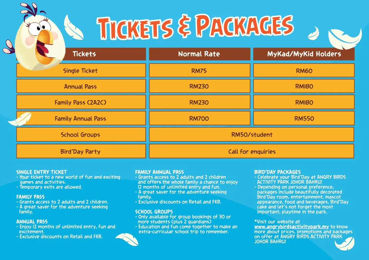 The park, valued at an estimated RM17 million, offers a variety of fun-packed activities, entertainment, and attractive games for the young generation and children such as Lazer Bird Shoot, Classic Tower Play, Red Bird Goal, Piggy Shooting Gallery, Captain Black Bird Ship, and others. Tickets are priced at RM75 per entry but for MyKad or MyKid holders, the tickets are priced at RM60. A variety of tickets from a single pass, family passes to unlimited annual passes are available.