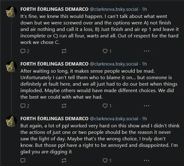 “But again, a lot of ppl worked very hard on this show and I didn’t think the actions of just one or two people should be the reason it never saw the light of day. Maybe that’s the wrong choice, I truly don’t know. But those ppl have a right to be annoyed and disappointed. I’m glad you are digging it.”