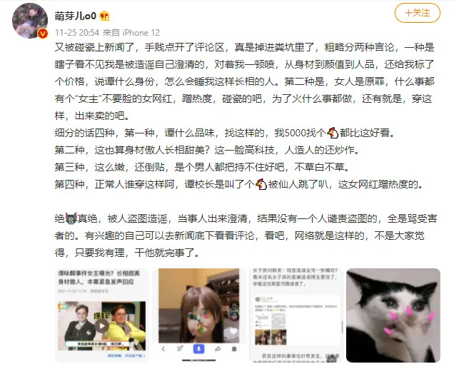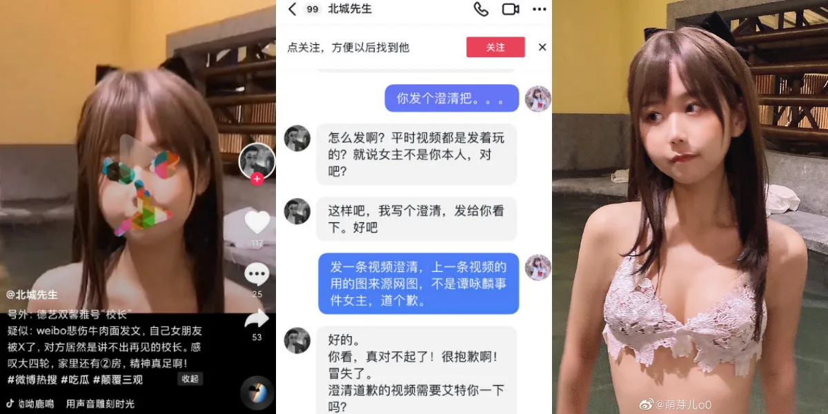 The falsely accused woman turned out to be an anime cosplayer, known on Weibo as “Sprout o0 (萌芽儿o0)”. Majority of her photos showcase her in various outfits with many on the more revealing side. According to her Weibo profile, she is only 19 years old, which doesn’t match with what was said about the girlfriend’s age.